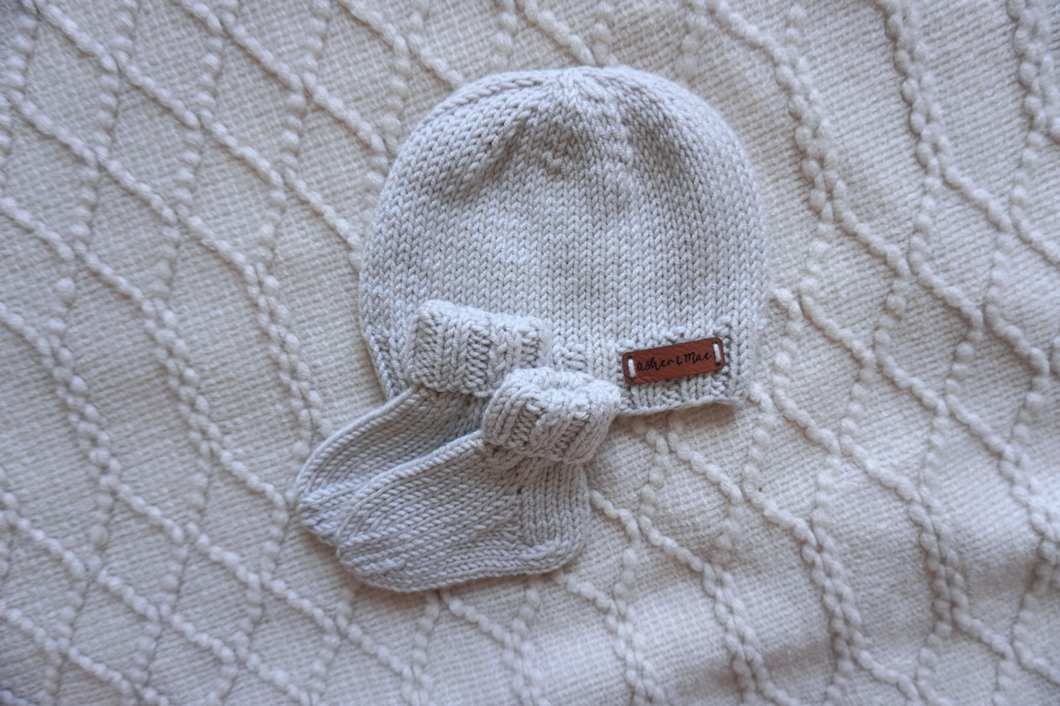 Welcome your little one with comfort, craftsmanship, and timeless charm in our Welcome Home Hat and Sock Set, hand-knit to order using a premium blend of cashmere and merino wool. This heirloom-quality set includes a cozy hat and matching socks in light gray—perfect for a newborn coming home outfit, a thoughtful baby shower gift, or a keepsake to treasure forever.
